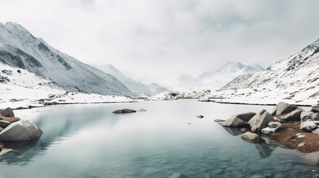This image showcases towering, snow-covered mountains reflected in the still surface of a lake. The scene is dominated by shades of blue and white, with a tranquil atmosphere. The composition emphasizes symmetry and balance. This visual can be utilized for various commercial projects and editorial uses related to nature.