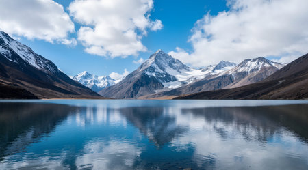 Majestic snow capped mountain peaks towering above a pristine glacial lake with the peaks perfectly reflected in the calm mirror like waters This breathtaking