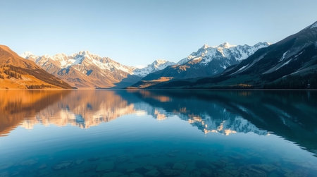 snow-capped mountains mirrored in a glassy alpine lake, created with generative ai