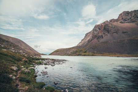 Beautiful view to mountain lake on background of mountains on horizon under cloudy sky. Atmospheric green landscape with lake in high mountain valley. Great scenery with mountain lake in highland glen