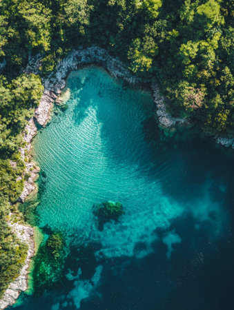 A serene body of water nestled among a lush forest, with towering trees and rugged rocks, A tranquil tropical lagoon with clear, turquoise water, AI Generated