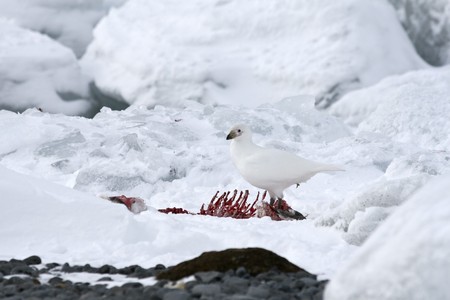 Snowy sheathbill (Chionis albus) feeding on the remains of a penguin