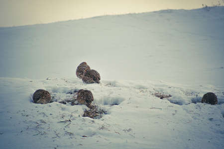 Dark winter day and wildlife in snow. Grey partridges searching for food and grass. Winter survival for birds. Selective focus on the animals, blurred background.