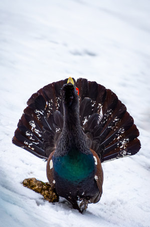 Capercaillie, Tetrao urogallus, single male in snow at lek or display ground, Norway, May 2024