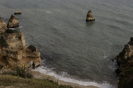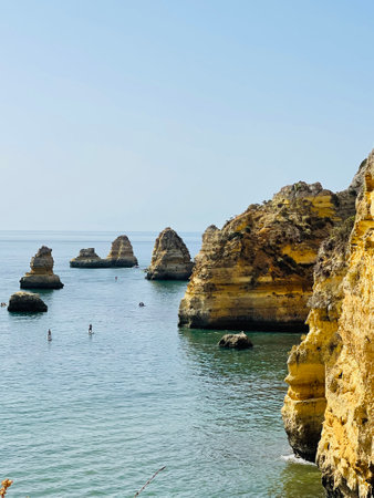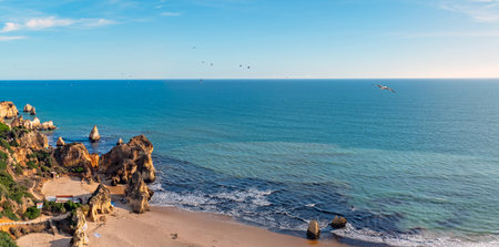 Atlantic ocean view of Algarve coastline. Beautiful seascape sunny beach in Lagos Portugal. Dream vacation picturesque destination. Serenity location for relaxation and contemplation.