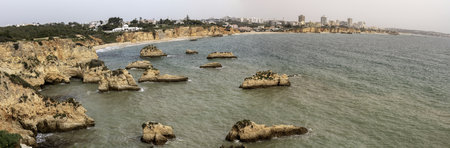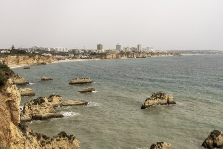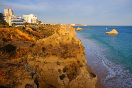 View on the beach Careanosy, Praia da Rocha and the town with block houses in Portimao, Algarve. Vacation in Portugal.