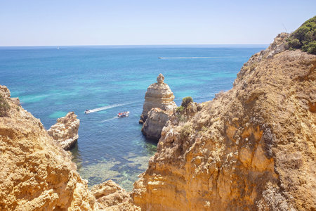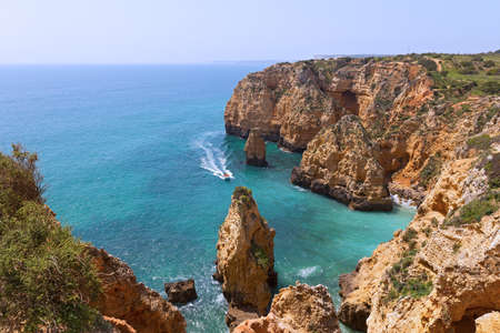 Ponta da Piedade near Lagos in Algarve, Portugal. Cliff rocks and tourist boat on sea. Praia Dona Ana, Estudantes beach. Sunny day. Point of Pity.