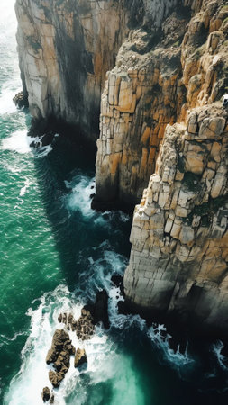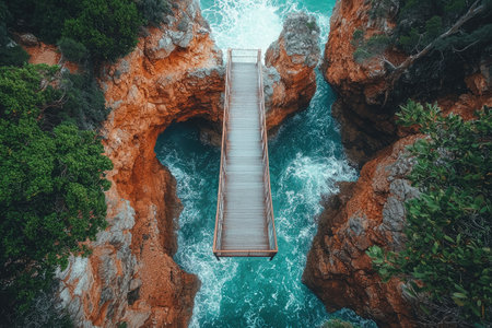 A photorealistic aerial view of the Oceanic Cliffs walkway, an elevated bridge connecting two rocky cliffs overlooking crashing blue waves along Australia's Great Ocean Road coastline. The high-resolution capture showcases intricate details and textures on the surrounding rocks with dynamic lighting. This shot is taken from above using a drone camera, providing a unique perspective that emphasizes the rugged beauty of the Australian coastal landscape. --chaos 30 --ar 3:2 --quality 2 --stylize 500 --v 6.1 Job ID: 4517571c-b21c-4c9d-855c-7527c1e9e4a7