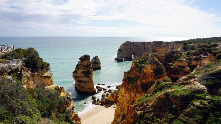 Landscape the rocks and cliffs, scenic ocean beach coastline Algarve Portugal, Europe. Sunny day, 2018. Panoramic nature beauty seascape view