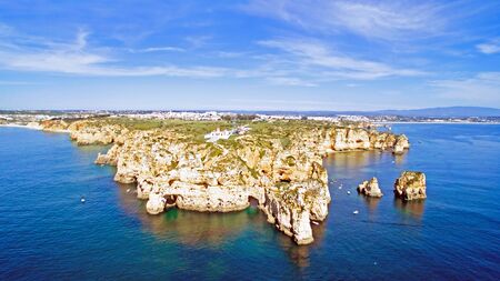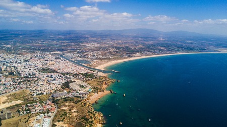 Aerial view of cliffs and beach near Lagos city in Algarve coast at Portugal