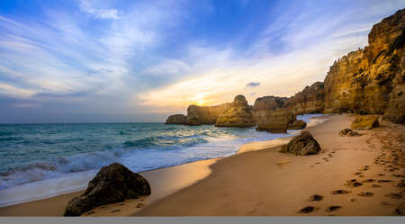 beautiful Atlantic ocean view horizon with sandy beach, rocks and waves at sunrise. Algarve, Portugal