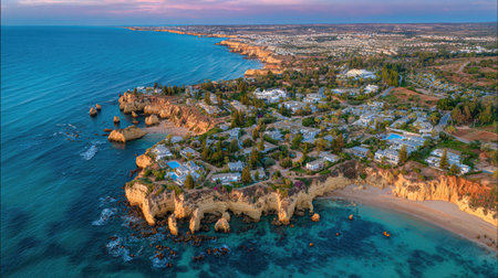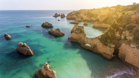 Aerial view of the cliffy coast in Portimao by sunset, Algarve, Portugal