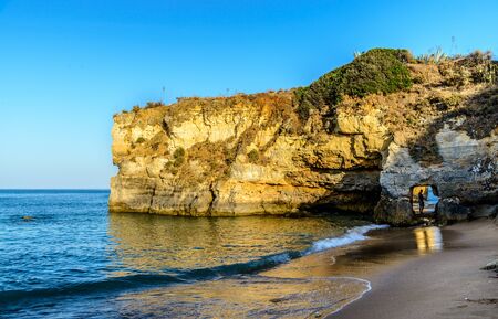 Cliffs of Pinhao Beach. View from below of the waves and empty sand at sunset. Concept of tourism and uncrowed travel. Algarve, Portugal