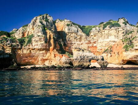Sightseeing of sandstone cliffs and grottoes by boat is one of popular pastime activity in Lagos, Portugal. Algarve coastline on a sunny morning in spring.