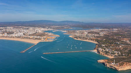 Aerial view of the panorama of the sea bay of Portimao, marinas with luxury yachts. Passing ships with tourists. High quality photo