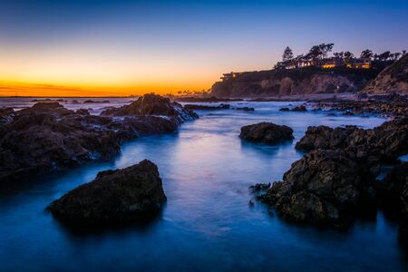 Rocks and waves in the Pacific Ocean at twilight, at Monument Point, Heisler Park, Laguna Beach, California.