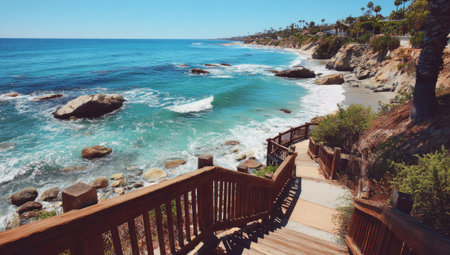 An inviting coastal scene unfolds, showcasing a wooden staircase descending onto a sandy beach. Turquoise ocean water meets the shore with gentle waves. The composition features a natural outdoor setting, suggesting a calm atmosphere. This image is suitable for various commercial uses, including travel and leisure content.