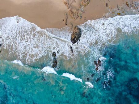 Aerial top view of the ocean colorful waves washing on the coast of the Pacific ocean. California. USA