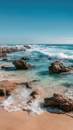 A scenic coastal view features ocean waves breaking over a rocky shoreline. The image showcases turquoise waters meeting a sandy beach and weathered rocks. The composition uses natural light under a clear blue sky. It is suitable for diverse commercial applications involving travel, nature, and scenic backgrounds.