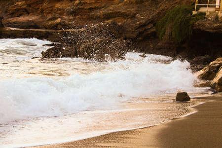Beautiful sunset light touches the wave approaching the rocks. At Victoria Beach,