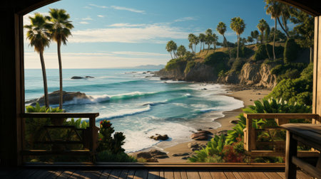 Serene beachfront view with palm trees, calm ocean waves, and vibrant blue skies, ideal for relaxation and vacation destination imagery