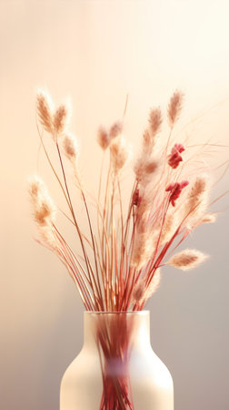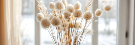 A beautiful arrangement of fluffy dried flowers in a vase enhances the warm ambiance of a bright apartment.