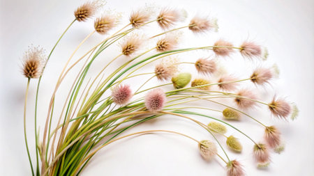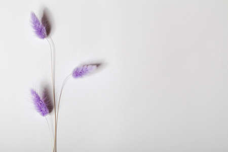Rabbit Tail Grass Dried Flowers on white background. Minimalistic composition. Romantic, nature background. Copy space.
