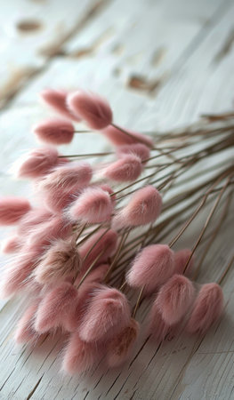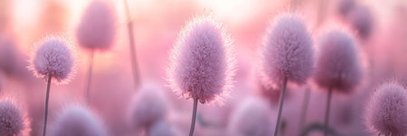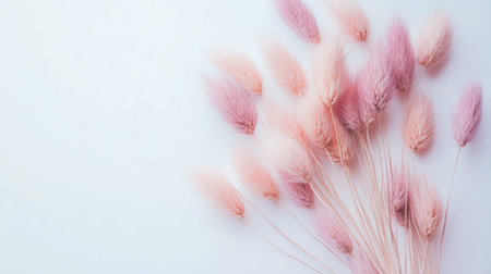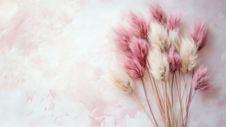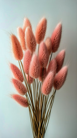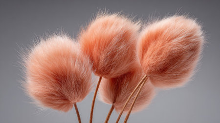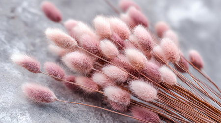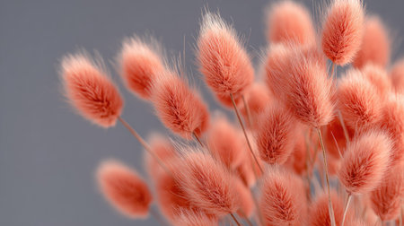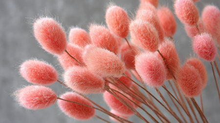 The image presents a close-up of delicate, fluffy bunny tail grass in shades of pastel pink. The texture appears soft and feathery, with a focus on the plant's unique shape. The background is a muted gray, providing a contrast that highlights the flowers. This image is suitable for various uses, including design and editorial applications.