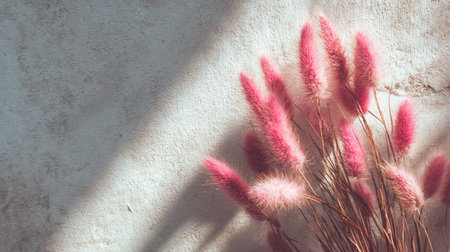 The image showcases delicate pink bunny tails against a weathered, textured backdrop. Soft, diffused sunlight casts dramatic shadows across the surface, highlighting the subtle textures. The composition offers visual interest with contrasting tones. Suitable for various design projects and editorial uses.
