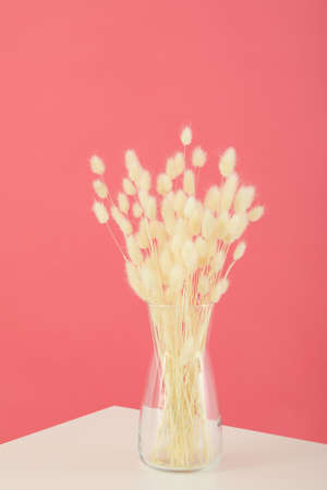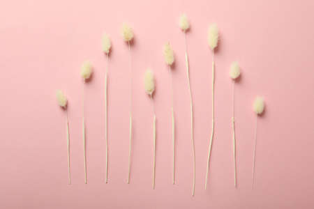 White bunny tail grass on pink background, dried lagurus grass top view