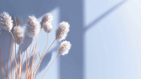 Delicate pampas grass stalks create a serene and minimalist aesthetic against a light blue background. Perfect for enhancing home decor with natural beauty and texture.