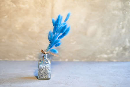 Dyed grass hares tail of the blue colour in decorative glass bottle. Minimalism on a gray background. Floristic