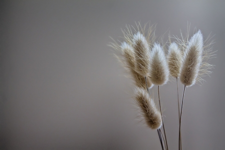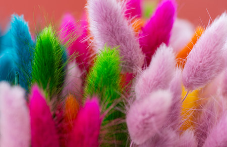 Hare's tail (Lagurus ovatus). Multicolored dry flowers. For bouquet arrangements and crafts. Minimalism concept. Space for text on the right. Close-up. Selective focus.