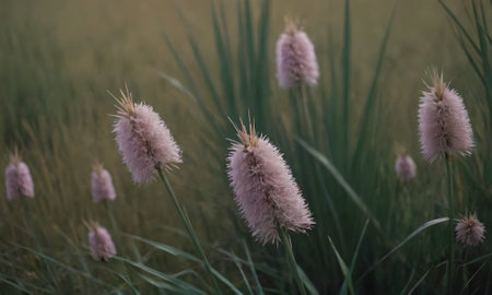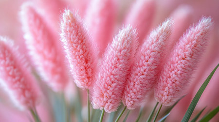 This image showcases delicate, pink bunny tail grass with soft, textured buds. The composition features a shallow depth of field, blurring the background. The lighting is soft and natural. Suitable for various applications, including print and digital projects, this image conveys a sense of elegance.