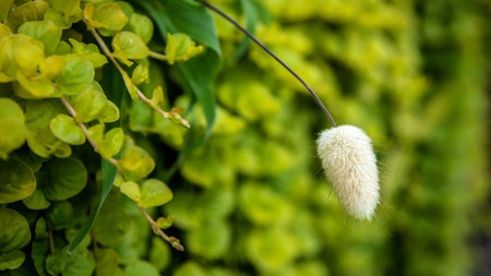 Hare's tail bud (lagurus ovatus) isolated, in front of a background of blurred green leaves