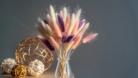A delicate bouquet of pastel-colored dried lagurus grass, some tips shimmering, arranged in a glass vase. It's accompanied by glowing golden wire spheres and woven decorative balls, set against a smooth grey backdrop.