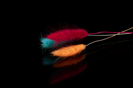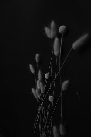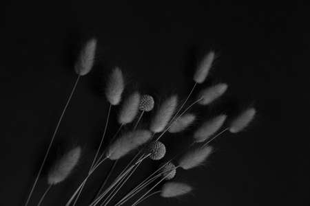 Dried lagurus flowers on a black background with reflection, macro