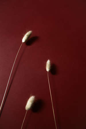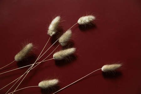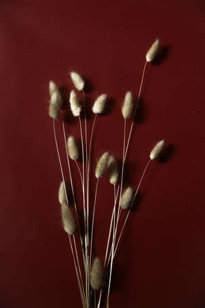 Rabbit bunny tail grass plant bouquet on burgundy background. Flat lay, top view.
