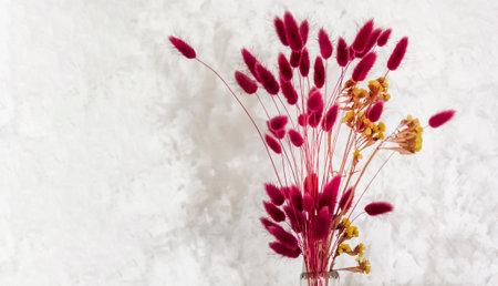 Minimalistic arrangement of red dried flowers on a beige background as a home decoration.