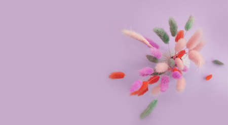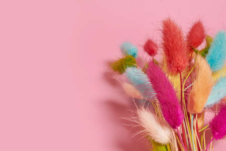 A bouquet of colorful dried lagurus flowers on a pink background. Copy space, flat lay, close up