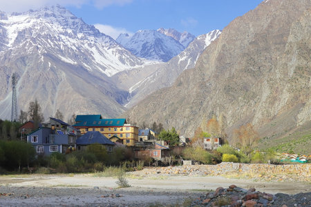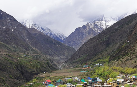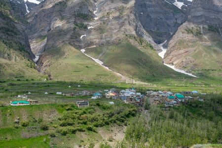 scenic landscape, snowcapped himalaya mountains and beautiful mountain village of lahaul valley, adventure traveling in himachal pradesh, india