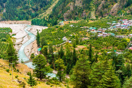 Landscape of Baspa river valley near Sangla village in Kinnaur district Himachal Pradesh, India. It is famous among tourists for picturesque river valley and apple orchards of famous kinnauri apples