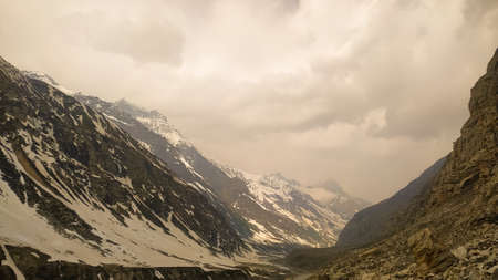 Rohtang Pass, Himachal Pradesh, India-October, 2019: The Heavy Snow caused slippery icy road condition on Leh Manali Highway Leading to suspension of vehicular movement at Rohtang Pass.