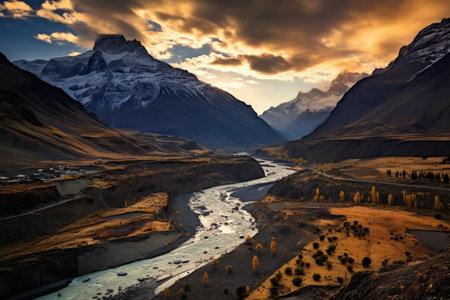 chandra river (chenab river) flowing through beautiful valley surrounded by snowcapped himalaya mountains at tandi, a mountain village in lahaul, himachal pradesh, india