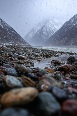 This scenic shot captures a rocky beach with snow falling, framed by majestic mountains in the background.