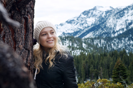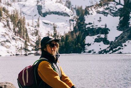 Young woman enjoying hiking outdoors at spring mountains near the peaceful lake.
