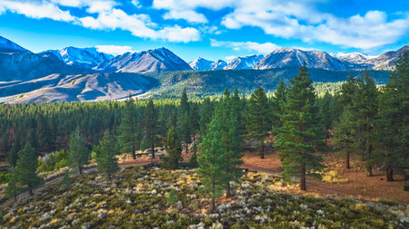 Aerial Mountain Landscape with Pine Forests and Meadows in Mammoth California