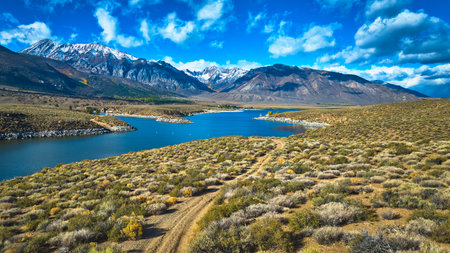 Aerial Crowley Lake Snow Capped Mountains and Trail Eastern Sierra California
