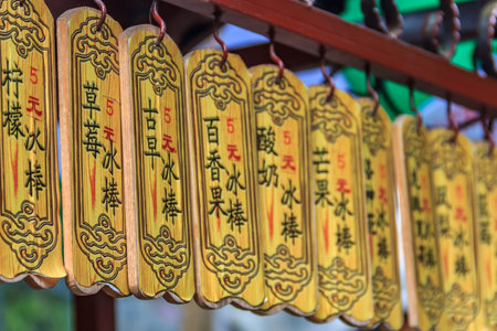 Gulangyu Island, China - September 17, 2013: Ornate menu of popsicle flavors at a Chinese market stall, left to right: lemon, strawberry, traditional, passion fruit, yogurt, mango priced at 5 dollars