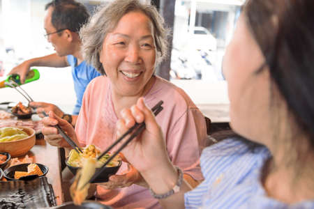 Happy mother and family having dinner and celebrating mothers day at restaurant